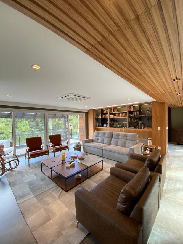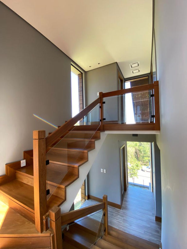 Uma casa moderna e imponente em terreno elevado. A madeira entra como um toque rústico característico do estilo serrano.