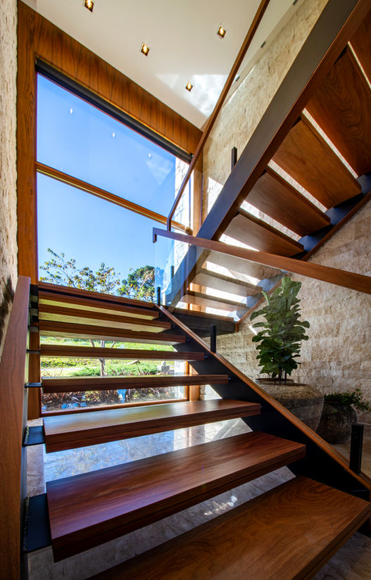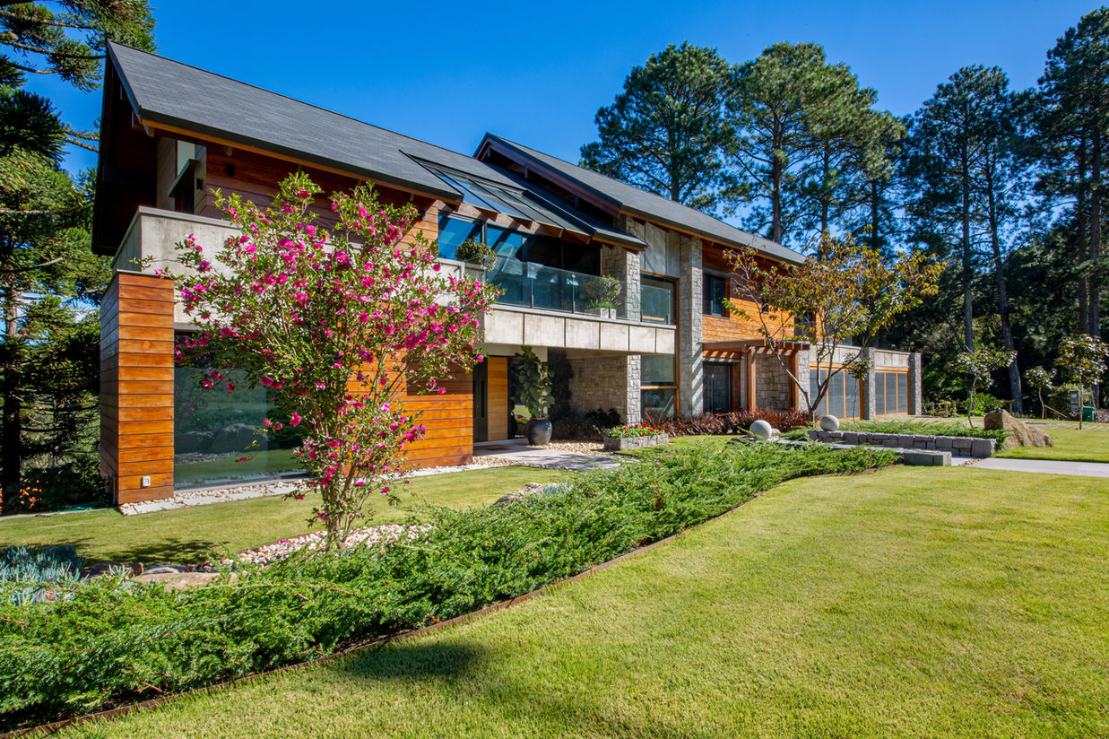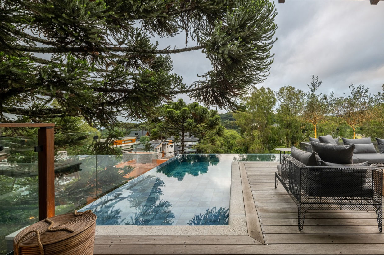Projeto moderno que explora o concreto em estado bruto na fachada principal, combinado com madeira e pedra. Nos fundos, um amplo deck com estar, lareira, piscina e área gourmet.